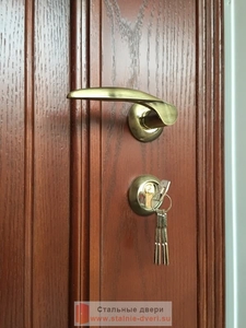 Изделие изготовлено из цельнометаллического листа и декорировано натуральным массивом с внешней стороны и шпонированной панелью изнутри. Оригинальный дизайн входной двери в коттедж подчеркивает стучалка и стильный карниз из резного массива.