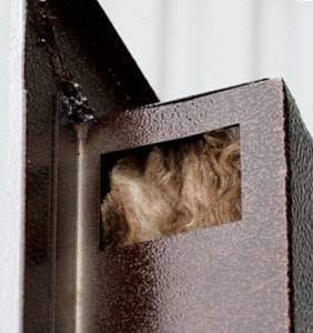 - Минеральная вата. Ей обычно укомплектованы утеплённые металлические двери. Универсальный негорючий волокнистый материал на основе горных пород с отличными качественными характеристиками. Её плюсом является экологичность.
